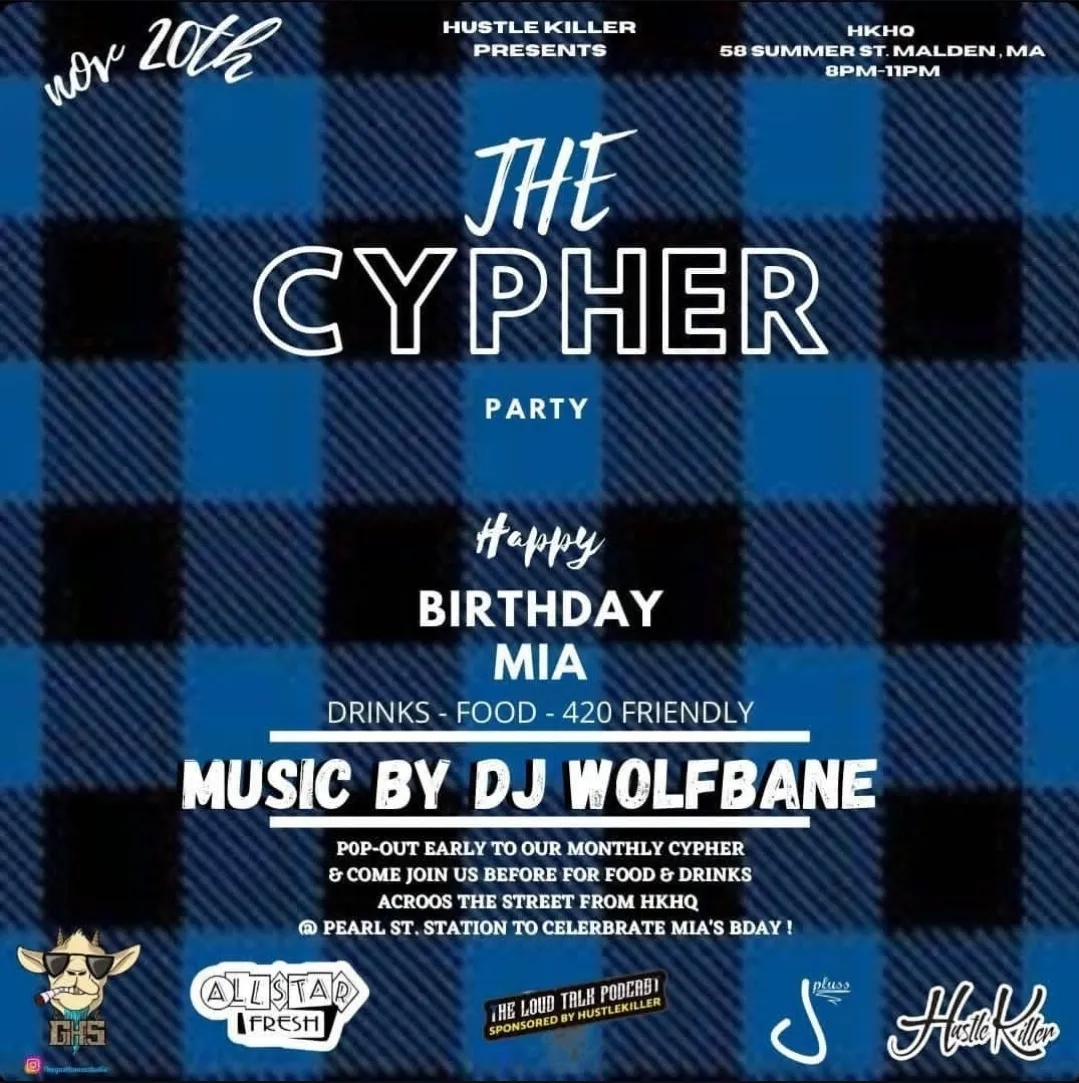 The Cypher Party at Hustler Killer – Malden, Malden, MA on November 20th, 2021